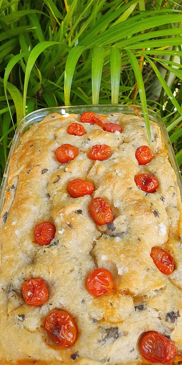 A focaccia foi feita com as folhas da erva-baleeira seca, que eu já possuía. Tirei os cabos e, com a mão mesmo, parti em pequenos pedaços que foram incorporados à massa durante o processo de sova. Como a erva baleeira tem um sabor intenso, optei por não colocar o clássico alecrim na cobertura da focaccia, que contou apenas com o tomatinho e o sal grosso.